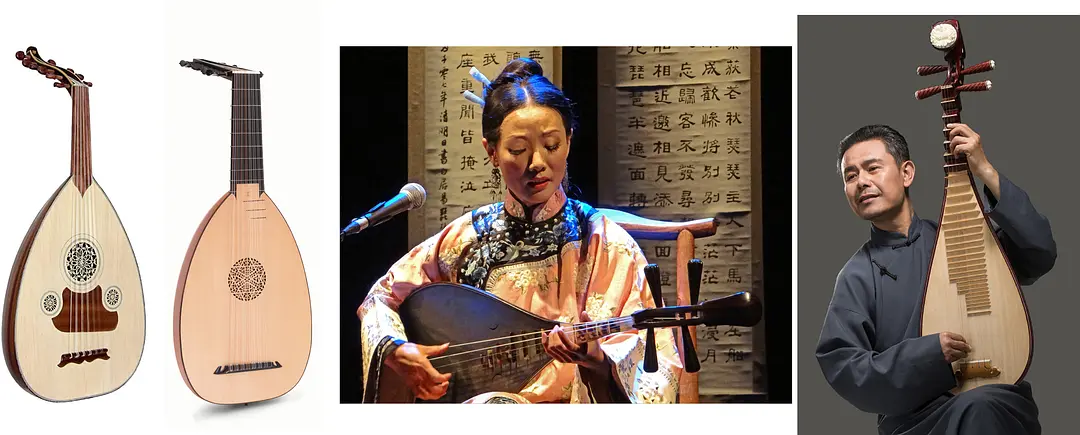 1. 乌德琴 2. 鲁特琴 3. 福建南音的横抱曲颈琵琶 4. 中原的竖抱直颈琵琶