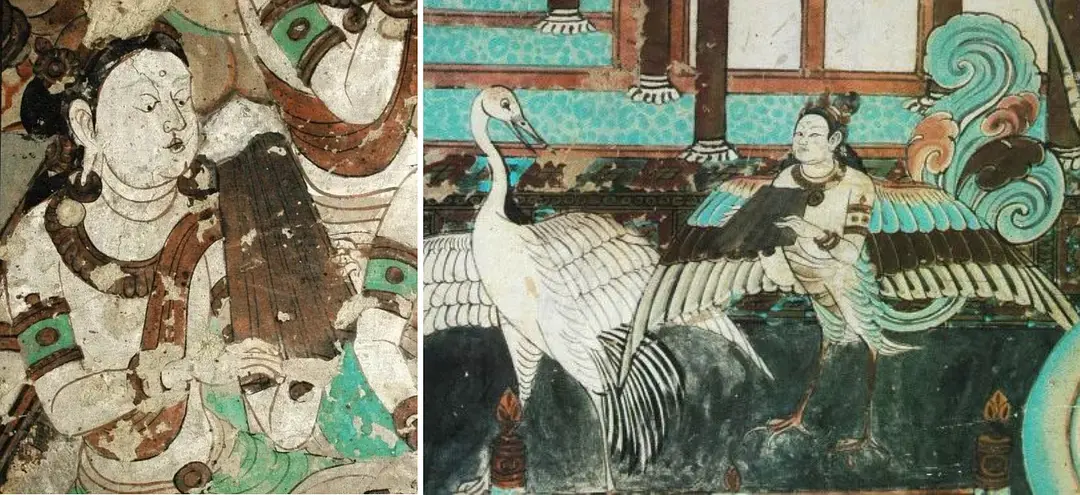 左:中唐 · 莫高窟14窟 右:手持拍板的迦陵频伽鸟