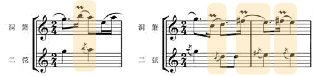 另外一个字,“和”,就是乐器之间究竟应该怎样相互配合,才能让音乐成为一个整体。举个例子,南音有一句话,叫“二弦入箫腹”,体现的就是这种乐器相合的审美追求。所谓“入腹”,就如下左图这个谱例,洞箫用了一个时值较长的润腔音B来装饰主音A,二弦要与洞箫配合也用B装饰A,但是二弦的B时值短得多,只在洞箫即将演出A这个主音前短暂出现。这种先后进入的做法,让音乐既协调统一又错落有致。下右图是另一个例子,出现了三次洞箫润腔音延长装饰主音,二弦入箫腹的情况。