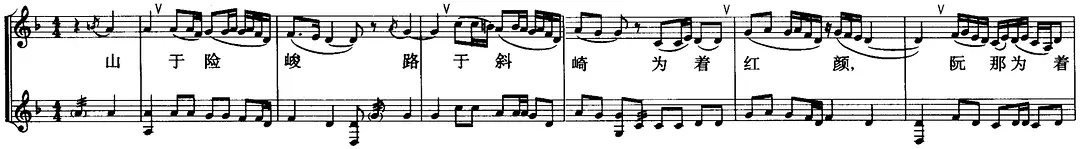 另外,上面这一段南音《三千两金》的演唱演奏,也很好地体现了中国传统音律在七声音阶的处理上“谱简腔繁”的做法。你会注意到,琵琶演奏出来的都只有五声音阶的骨干音,但是在唱腔中,却添加了许多变徵、变宫等偏音,作为主音间装饰性、润腔性的连接,这种演奏和唱腔的配合与对比,让音乐整体显得丰富多彩又细腻委婉,让演唱更具有即兴的意味。直接看记谱更加简单明确: