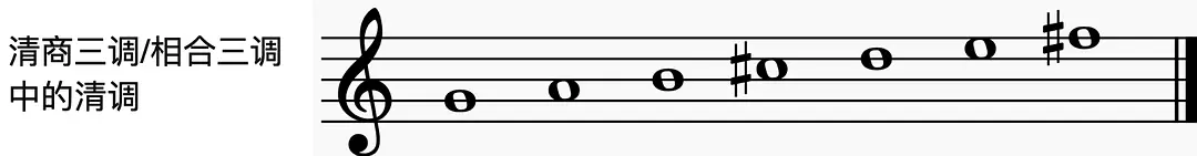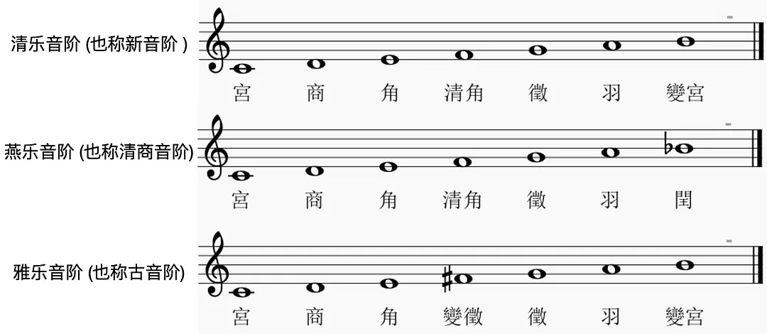 另外,汉乐府到隋唐期间,还有“清商三调”这种特殊的宫调系统,有“平”“清”“瑟”三调,据刘有恒考证,“平调“可能对应的就是上述的雅乐音阶,“瑟调”是清乐音阶以清角 (F) 为调首的转调,而“清调”则是以徵(G) 为调首音,加入变徵 (F♯) 和 清宫 (C♯) 的七声音阶: