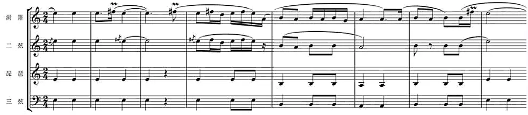 所谓“中”,就是在器乐合奏中,谁主谁次关系非常明确。从下面这个谱例可以看出,琵琶和三弦所奏旋律,比起洞箫和二弦,要简单平直的多。这是因为琵琶始终是音乐的主线,它演奏的是五声调式为主的音乐骨架,具有无上的权威;三弦在低八度完全照搬模仿琵琶,为琵琶提供低音支持。而洞箫和二弦,则多了许多偏音的装饰音,对旋律骨架进行“润腔”,让音乐变得灵活多变有声有色。而在实际演奏中,这种主次关系也通过演奏者的空间位置表现出来,“执节者歌”居中,琵琶和三弦在演唱者的右手边为尊,洞箫和二弦则居左。
