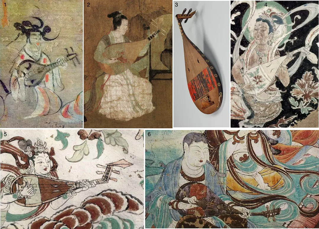 1. 晋 · 酒泉丁家闸壁画 2. 宋摹唐 · 韩熙载夜宴图 3. 日本正仓院藏唐代紫檀木画槽曲项琵琶 4-6. 敦煌壁画:4. 西夏 榆林10;5: 宋 · 榆林15(拨弹琵琶);6. 唐 · 榆林25